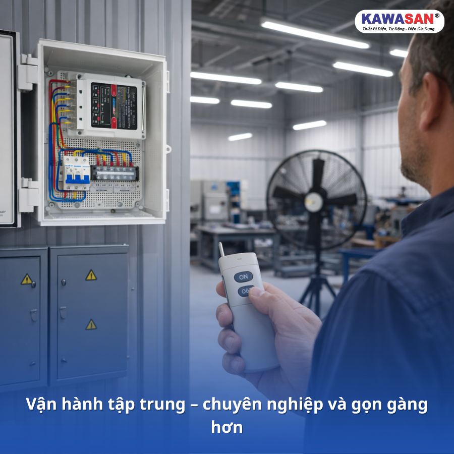 Đề xuất hình ảnh: Hình ảnh tủ điện công nghiệp có gắn thiết bị điều khiển từ xa và một người đang sử dụng remote. Alt text: “Tủ điện công nghiệp 3 pha tích hợp bộ điều khiển từ xa Kawasan”