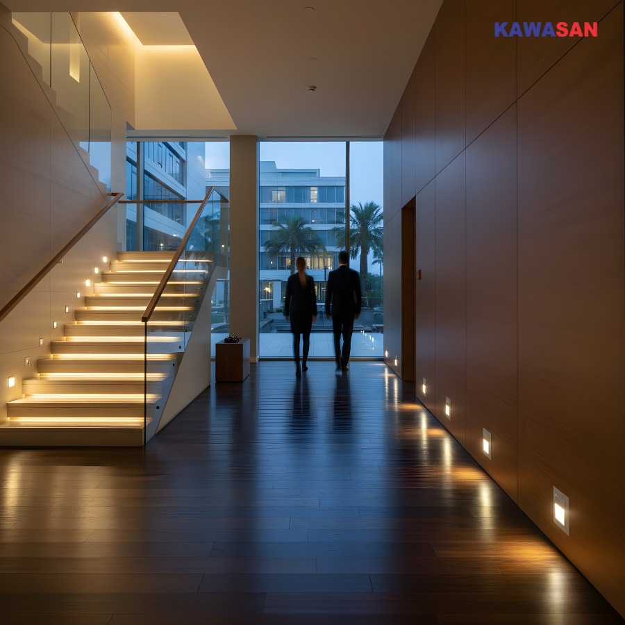 đèn nằm gọn trong bậc thang hoặc mép tường, ánh sáng hắt nhẹ xuống sàn, tạo cảm giác ấm cúng, sang trọng.