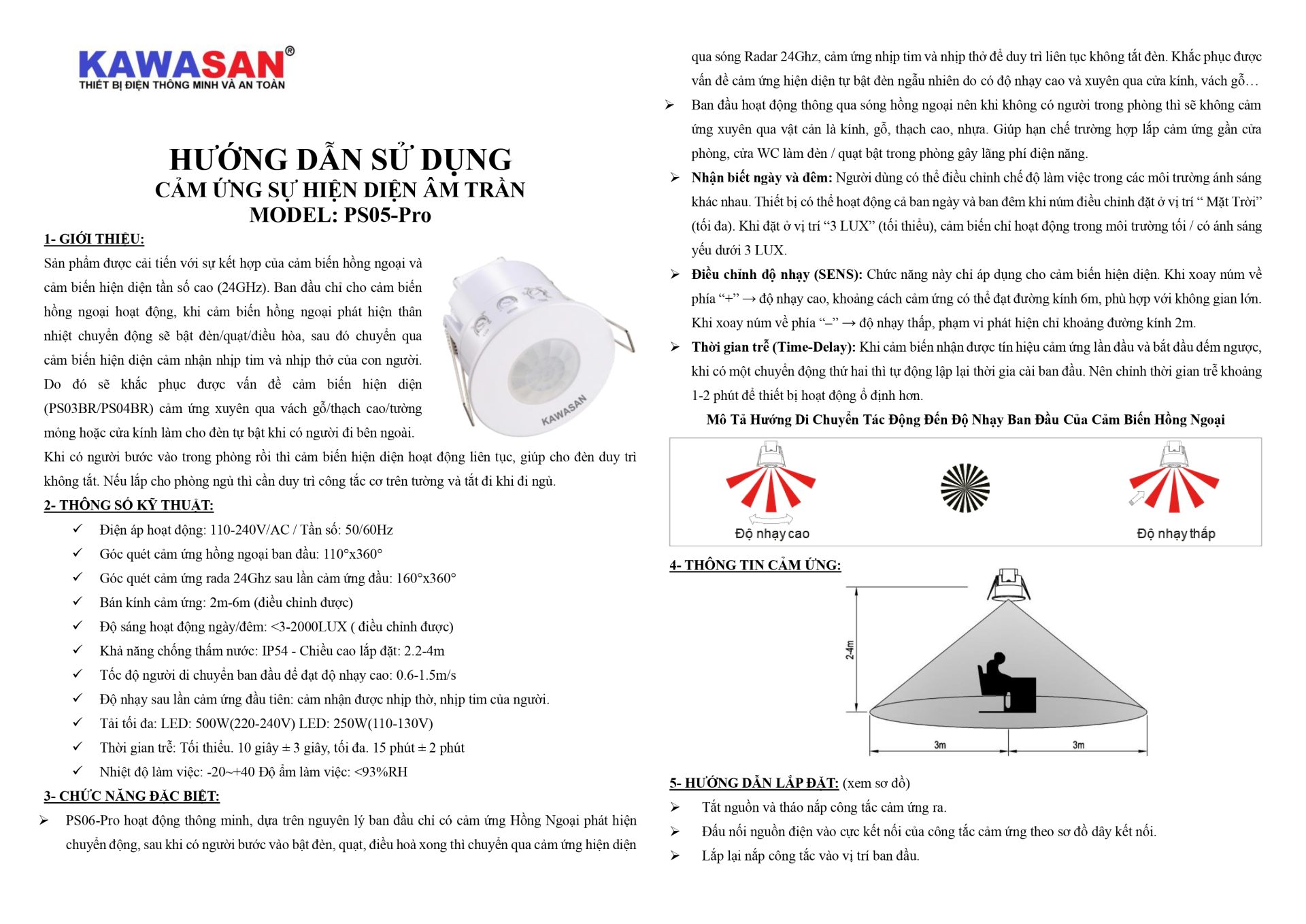 PS05-Pro là cảm biến hiện diện âm trần thế hệ mới của Kawasan, được nâng cấp với công nghệ kép PIR + Radar 24GHz, mang đến khả năng phát hiện chuyển động chính xác và nhận diện sự hiện diện liên tục của con người ngay cả khi đứng yên. Thiết bị vận hành theo cơ chế thông minh 2 bước:- Bước 1 – PIR kích hoạt: Khi có chuyển động thân nhiệt, cảm biến hồng ngoại (PIR) bật đèn/quạt/thiết bị điện.