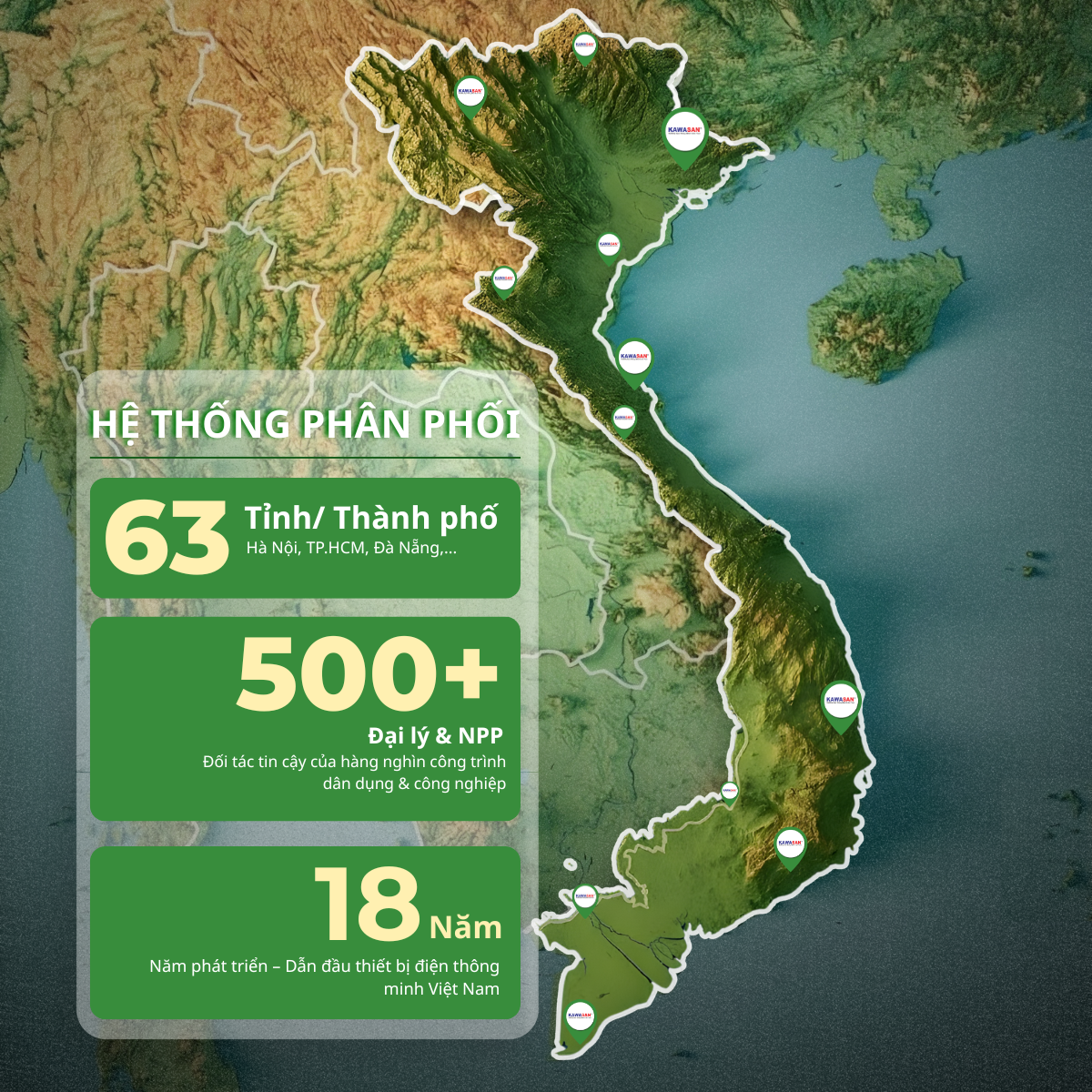 - Kawasan hiện có trụ sở tại HCM, chi nhánh tại Hà Nội, Đà Nẵng và xưởng SX, Lắp ráp tại Q12. HCM.
