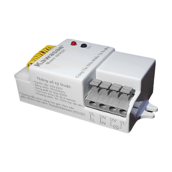 - Nhấn giữ nút SET 3~5 giây, đèn báo nhấp nháy thì bấm 1 nút trên remote (giữ 1~2 giây) thấy đèn tắt thì nhả tay ra. Sau đó đèn chớp lại thì bấm lại nút đã chọn vừa bấm trên remote, đèn báo tắt là thành công. Nếu muốn chọn 1 nút ON và 1 nút OFF khác nhau thì khi bấm lần 2 (trên remote) thì chọn 1 nút khác.