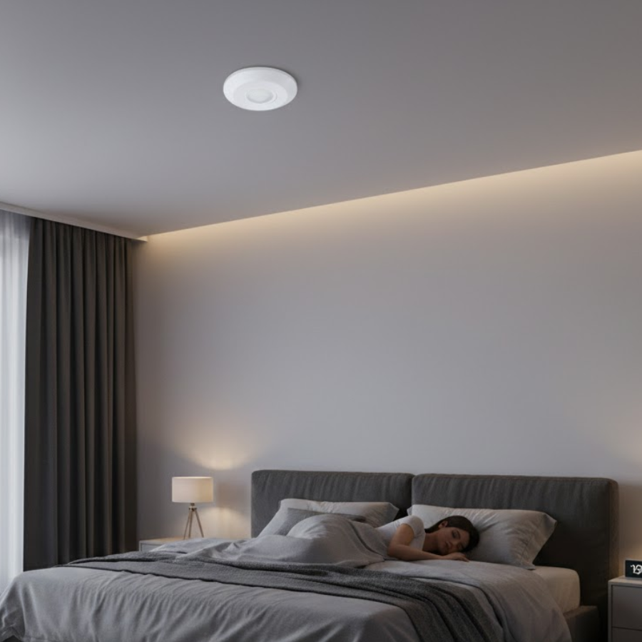 PS05-Pro sử dụng PIR để kích hoạt bước đầu, sau đó chuyển sang radar 24GHz để cảm nhận hiện diện tĩnh → không tắt đèn khi người đứng yên hoặc nằm.
