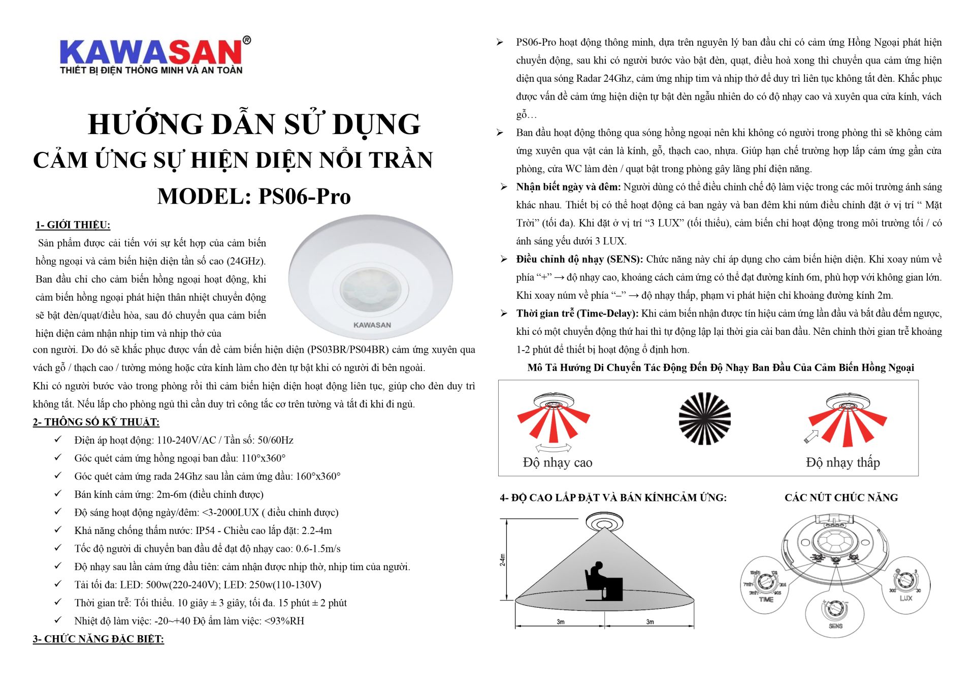 PS06-Pro là phiên bản cảm biến hiện diện thế hệ mới của KAWASAN, sử dụng kết hợp cảm biến hồng ngoại (PIR) và radar hiện diện 24GHz để phát hiện chuyển động và cảm nhận sự tồn tại của con người qua nhịp thở – nhịp tim. Khác với các mẫu cảm biến hiện diện truyền thống dễ bị kích hoạt xuyên qua cửa kính, vách gỗ hoặc tường mỏng, PS06-Pro khắc phục hoàn toàn hiện tượng bật đèn ngoài ý muốn nhờ cơ chế thông minh 2 bước:- Bước 1: PIR kích hoạt khi có người bước vào → bật đèn/quạt.