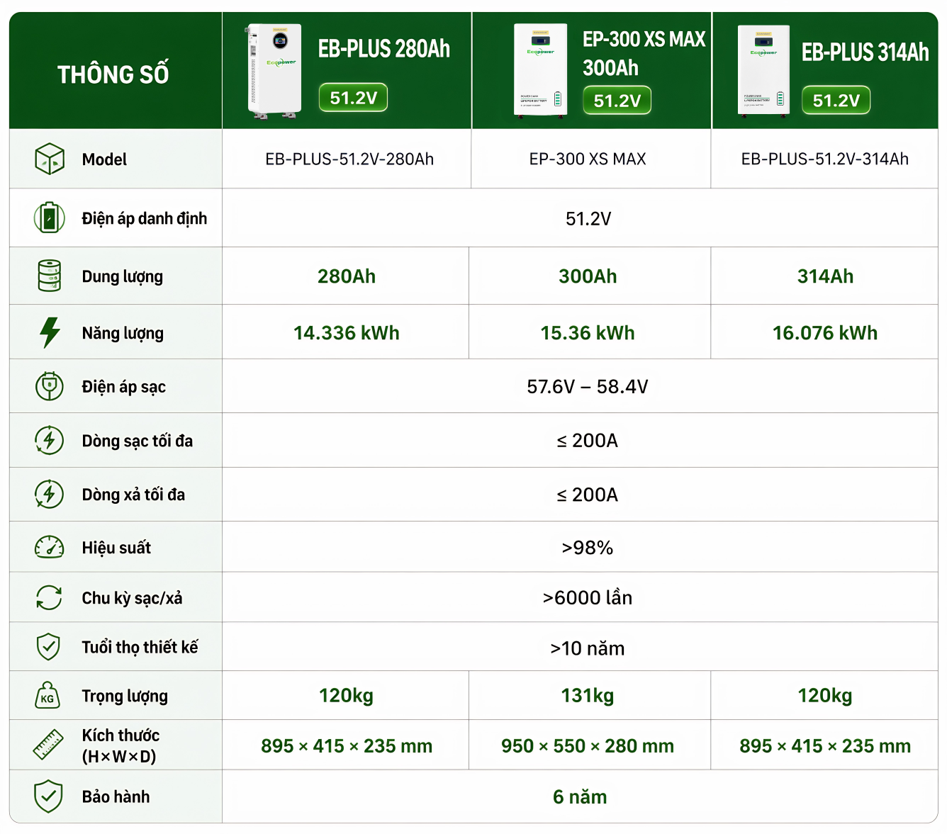 • Trong khi đó, các dòng EB-PLUS 51.2V 314Ah và EP-300 XS MAX 300Ah với dung lượng lớn hơn sẽ phù hợp cho hệ thống điện mặt trời công suất lớn như biệt thự, trang trại, nhà xưởng, đảm bảo nguồn điện ổn định và liên tục.