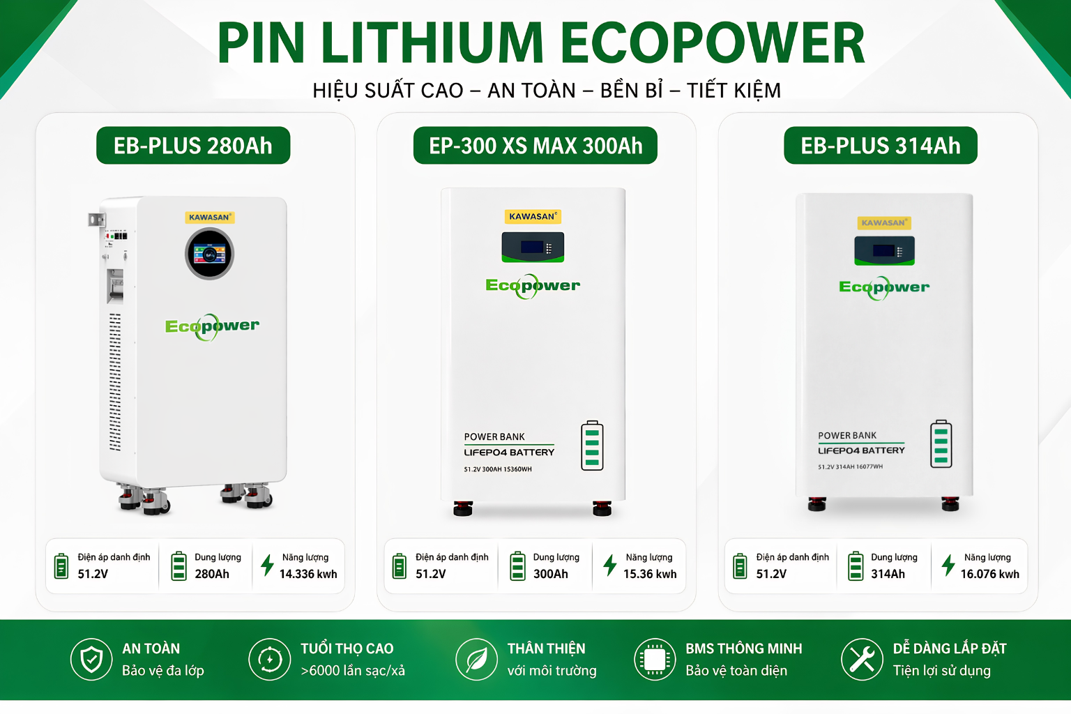 Pin Lithium Lưu Trữ Ecopower, Nhãn Hiệu Kawasan LiFePO4 51.2V (280Ah / 300Ah / 314Ah) – Dùng Cho Điện Mặt Trời & Lưu Điện Dự Phòng