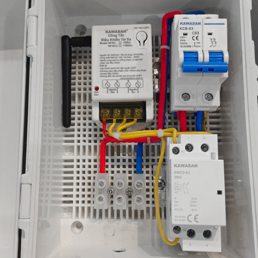 Từ khóa phụ: tủ công suất 63A, công tắc RF10A, remote RM2C, điều khiển thiết bị từ xa, hộp kín nước.