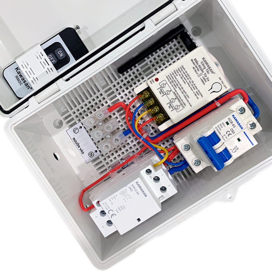 - Kiểm tra đầy đủ các linh kiện trong bộ sản phẩm: khởi động từ, cầu dao, công tắc RF10A, remote RM2C…